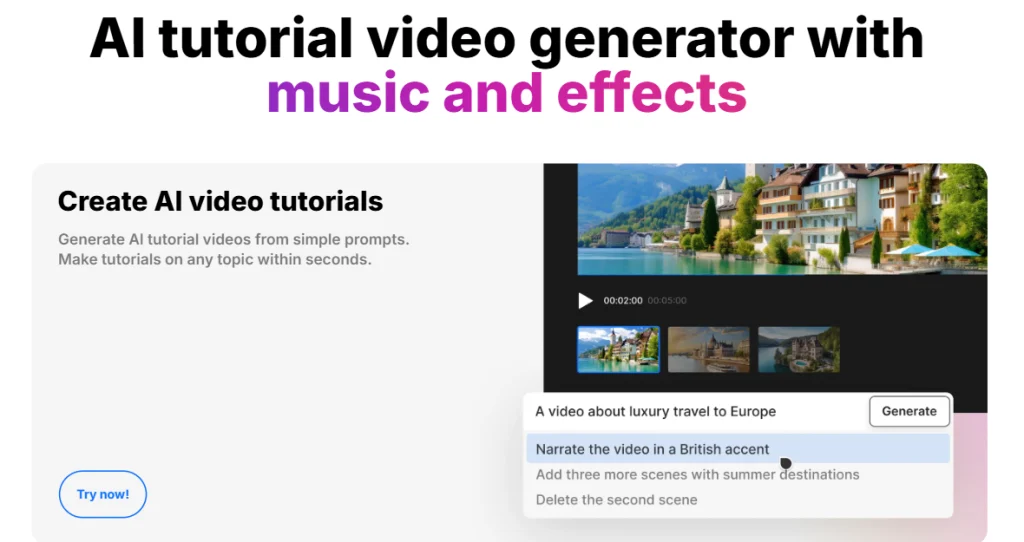 The AI handles all aspects of the tutorial video production and content generation, including voiceovers, scene creation, subtitles, generative media content, and special effects (SFX). This free tutorial video maker supports more than 50 languages, including English, French, Spanish, and Italian.