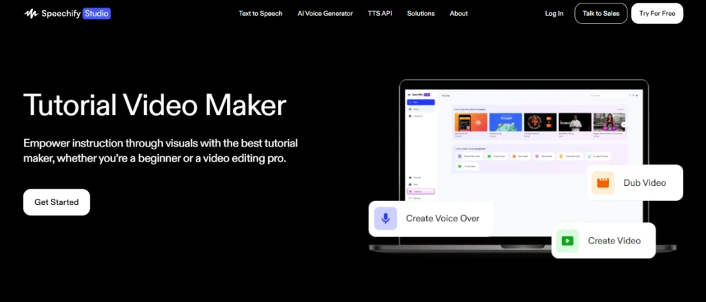 Speechify is a tutorial video maker suitable for both beginners and professionals. Its drag-and-drop interface is easy to use for creating videos and adding customizations, such as text fonts, video clips, images, annotations, screen recordings, overlays, animations, transitions, effects, and AI-generated voiceovers.