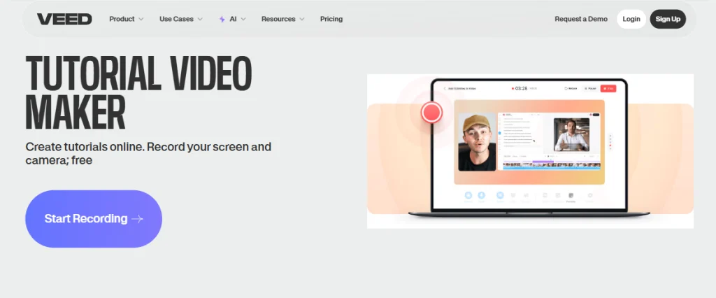 Veed is a free tutorial video maker that offers two ways to make tutorials. You can record the actions on your computer screen and the video from your webcam or digital camera to create the perfect tutorial videos for your audience. Use the built-in video editor to personalize your recorded videos by adding text, music, subtitles, images, and more.