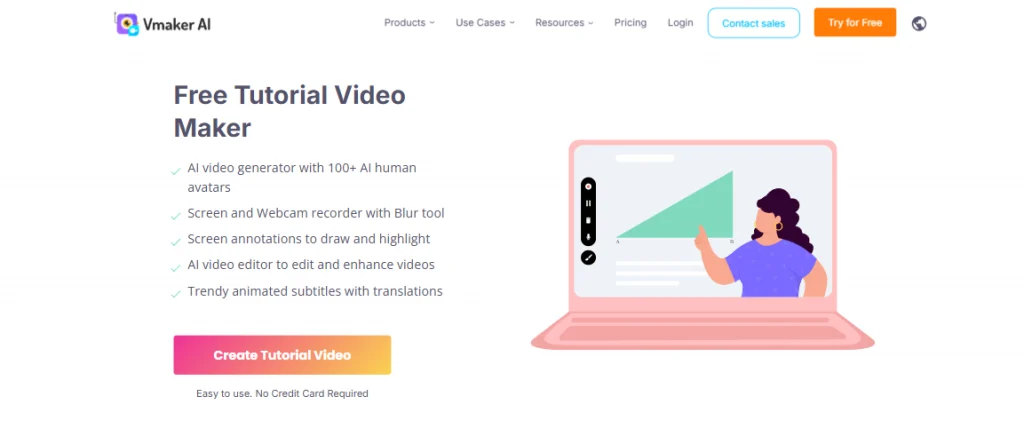 Vmaker AI is a free tutorial video generator with numerous built-in features to create tutorial videos quickly, including over 100 AI-generated human avatars, a screen recorder, a webcam recorder (with a background blur tool), screen annotations, animated subtitles, translations, and more. This animated tutorial maker supports over 150 languages for subtitle generation and text-to-speech options.