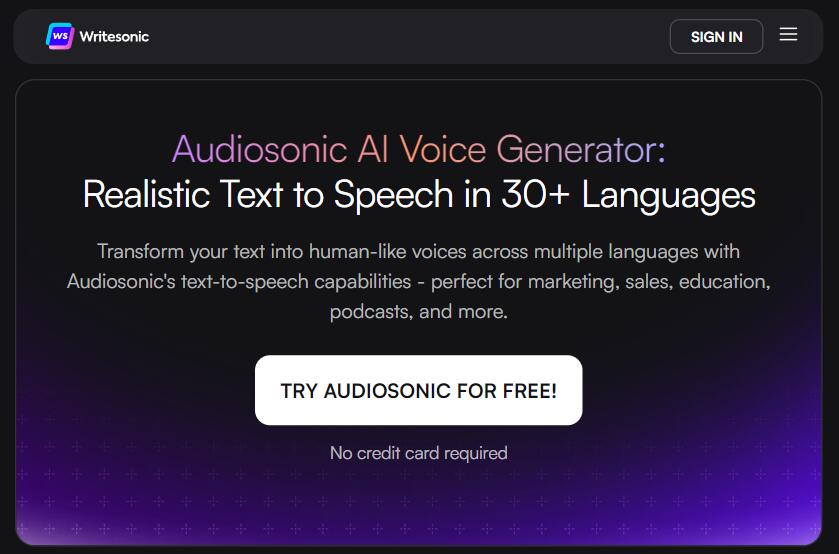 Audiosonic od Writesonic okamžitě dodá vašemu psaní přirozeně znějící, lidský hlas. Pokud jde o poskytování vynikajících zvukových zážitků uživatelům, jeho schopnost převodu textu na řeč má potenciál být revoluční. Umělá inteligence pro tvorbu hlasu je komplexním řešením pro všechny vaše potřeby, ať už plánujete marketingové kampaně, vytváříte prodejní prezentace, vytváříte výukový materiál nebo spřádáte fascinující příběhy podcastů. Některé z funkcí, díky kterým vyniká, jsou: