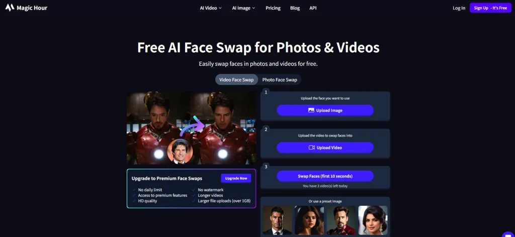 Jste připraveni na ještě větší zábavu a vzrušení? Magic Hour to přináší do vašich videí a dokonce i fotografií! Můžete snadno nahrát videa, ve kterých chcete vyměnit obličeje, nebo si vybrat z přednastavených obrázků v galerii. Magic Hour nabízí výměny obličejů ve studiové kvalitě s integrací umělé inteligence, což zajišťuje bezpečné a bezplatné funkce výměny obličejů. Aplikace podporuje rozlišení až 4K, transformuje jakýkoli typ videa a poskytuje mnoho dalších užitečných nástrojů.