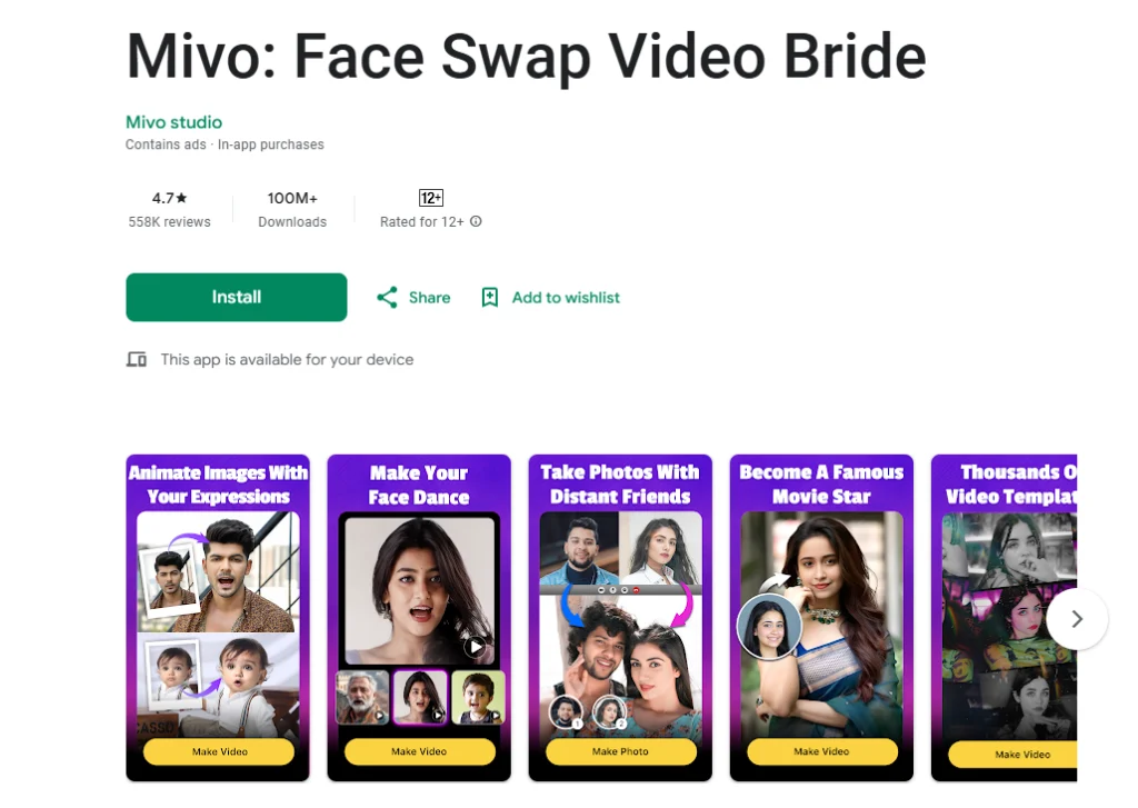 Hledáte snadný způsob, jak si ve videích vyměnit obličeje? Mivo – Face Swap Video Bride je ideální nástroj pro chytrou detekci a provádění výměn obličejů. Tato video aplikace s výměnou obličejů nabízí fotografické efekty s umělou inteligencí spolu s hudebními šablonami. Jediným kliknutím můžete nahradit obličej ve videu vlastním a okamžitě si vytvořit vlastní portréty s umělou inteligencí, aniž byste museli navštívit fotoateliér. Nainstalujte si ji a vyzkoušejte funkci tvářového tance a funkci transformace líčení.