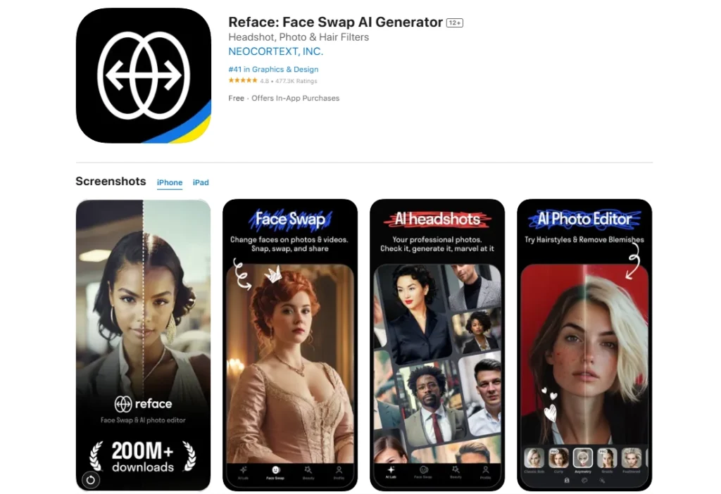 Pokud jste uživatelem systému iOS, aplikace Reface pro výměnu obličejů ve videích je pro vás ideální. Funguje bez problémů na vašem iPhonu nebo iPadu. Výměna obličejů na fotografiích a videích je s touto aplikací hračka. Pomocí inovativního nástroje pro výměnu obličejů s umělou inteligencí můžete snadno vytvářet úžasné portréty. Navíc je personalizace obsahu jednoduchá – můžete vyzkoušet různé účesy, vytvářet zábavná přáníčka k různým příležitostem a mnoho dalšího. Uživatelé si mohou také vyzkoušet funkce Reface, jako jsou avatary s umělou inteligencí, generátor neomezených fotografií miminek a generátor portrétů s umělou inteligencí.