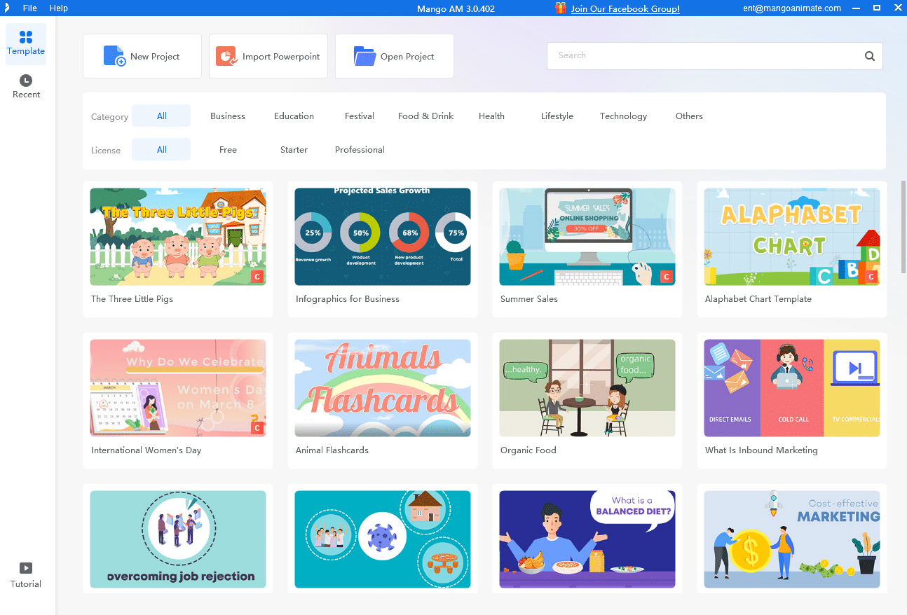 Mango Animation Maker, også kendt som Mango AM, kan prale af en brugervenlig grænseflade, der passer til alle, selv for begyndere til at lave animationsvideoer. Det intuitive design giver dig mulighed for nemt at navigere gennem softwaren og få adgang til en bred vifte af kreative aktiver og tilpasningsmuligheder. Du kan vælge mellem en omfattende samling af veldesignede skabeloner, animerede figurer og overgangsanimationer for at tilpasse din intro præcis, som du forestiller dig den.
