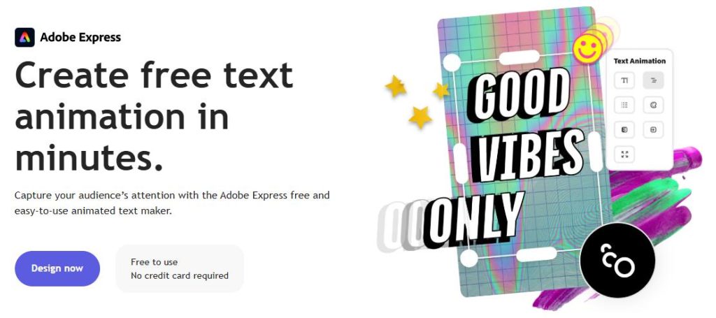 Adobe Express ist ein kostenloser Textanimationsgenerator eines renommierten Softwareentwicklers. Sie müssen lediglich Text hinzufügen und Schriftfarben, -größen und -stile anpassen. Anschließend können Sie Hunderte von Animationsoptionen durchsuchen, bis Sie die ideale für Ihr animiertes Textvideo gefunden haben.