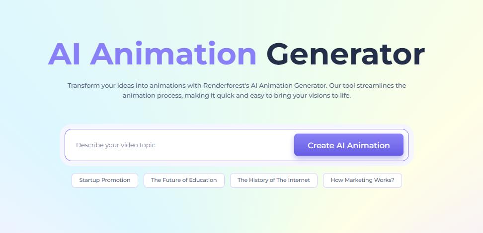 Renderforest ist ein KI-Animationsgenerator Aus Textideen, die Sie in ein Beschreibungsfeld eingeben, generiert die KI schnell ein animiertes Video mit Aktionen und Bildern basierend auf einer einfachen Beschreibung. Das Tool ermöglicht Ihnen die individuelle Anpassung des Videos durch Auswahl von Bildschirmgröße, Geschlecht, Stimme und Animationsstil des Sprechers.