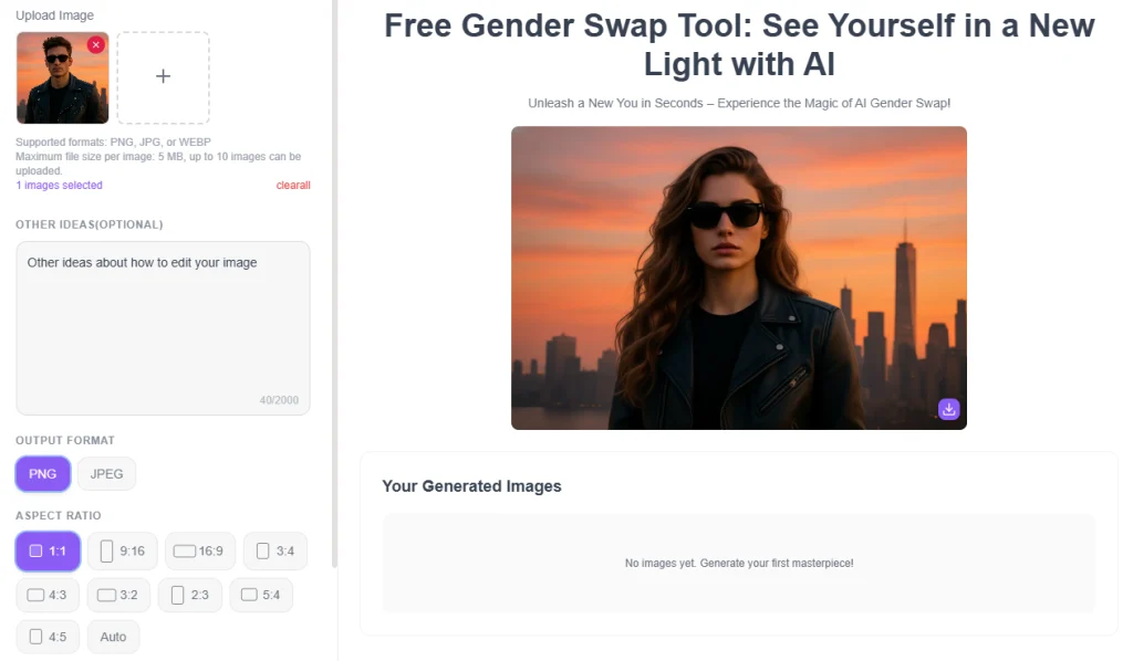 Bylo AI is a state-of-the-art AI gender-swap app with two Google AI model versions: Nano Banana and Nano Banana Pro. You can either upload a single person image or source and target images for a more specific gender appearance. There is also a section where you can describe the specific details of the gender transformation or overall scene that you would like to see in the final gender swap image. The output formats are PNG and JPEG, and the aspect ratios are 3:4, 16:9, 9:16, 1:1, and several others.