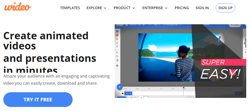Como creador de presentaciones de vídeo gratuito para principiantes, Wideo es una plataforma totalmente online. Tu obra maestra se puede terminar sin necesidad de descargarla. Diseñado para personas sin experiencia, Wideo es intuitivo y cuenta con una amplia gama de funciones para hacer que sus presentaciones de vídeo sean más impresionantes. Puede crear fácilmente videos animados y obtener resultados profesionales en minutos. Con el último clic, comparte y descarga tus vídeos en formato MP4.