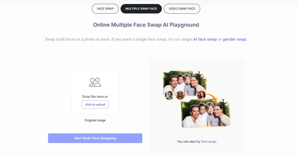 Tämä kasvojenvaihtosivusto tarjoaa ilmaisen, selainpohjaisen kasvojenvaihtopelin, jossa käyttäjät voivat vaihtaa kasvoja helposti valokuvissa ja videoissa. Lataa lähdekuva ja kohdekuva, paina ”Vaihda kasvot” ja katso, kuinka tekoäly toimii saumattomasti. korvaa kasvot—jopa useiden ihmisten tai täysliikkuvan videon kanssa. Työkalu käsittelee myös eräajoja ja GIF-kuvia, kaikki ilman vesileimoja tai vaadittuja rekisteröitymisiä.