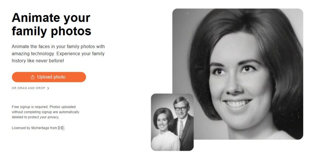 תוכנת האנימציה Deep Nostalgia של MyHeritage פיתחה יותר מ-116 מיליון אנימציות ביצירת אפקטים עבור מיליונים ברחבי העולם. הוא משתמש בלמידה העמוקה המתקדמת של D-ID כדי להפוך תמונות סטילס לפורטרטים נעים שנראים אמיתיים. זה מאפשר לך להרגיש קשר עם אבותיך באמצעות תמונות זזות. אנימטור התמונות משפר תמונות עם אנימציות מציאותיות וקל לשימוש. זה עובד היטב כדי להחיות תמונות משפחתיות, וליצור קשרים רגשיים חזקים על פני דורות. בעוד שהכלי יכול להנפיש פנים אחד בכל פעם, הוא משמש כקישור ייחודי בין עבר להווה. זה מוסיף עומק לחלק הסיפור של חקר ההיסטוריה המשפחתית.