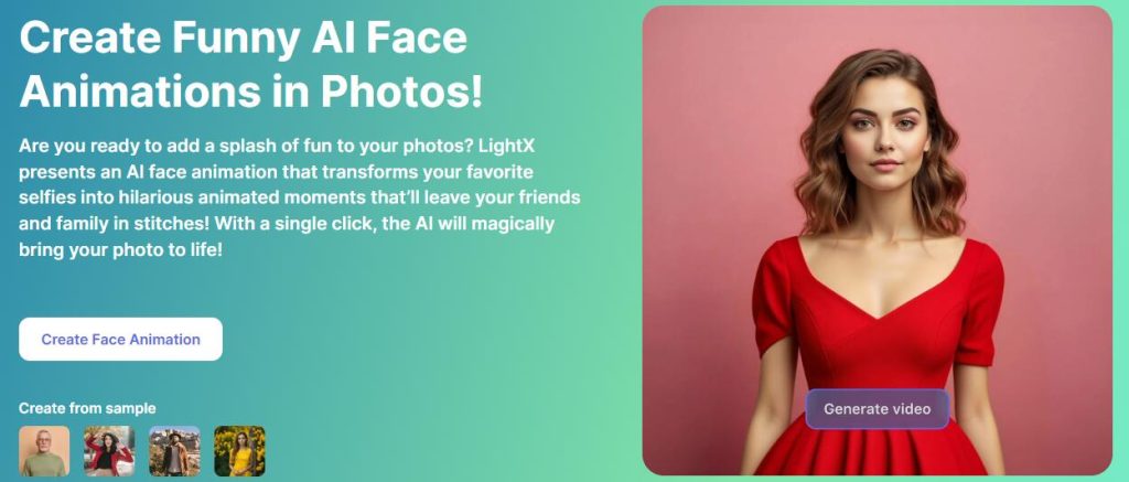 LightX je idealan generator animacije lica jednim klikom. Nudi ogromnu biblioteku predložaka pokreta lica, uključujući geste, osmijehe, govor, pjevanje i još mnogo toga. Napredni algoritmi umjetne inteligencije mogu mapirati precizne lokacije lica na fotografijama, osiguravajući da animirani izrazi lica publici izgledaju prirodno i dinamično. Uz to, LightX ima uređivač videozapisa koji vam omogućuje da prilagodite svoje animirane videozapise lica na nekoliko kreativnih načina, uključujući dodavanje zvuka, glazbe, govora, animiranog teksta, ilustracija i animiranih naljepnica. Ne postoji ograničenje koliko ovaj alat može transformirati vaš dosadni statični portret u živopisnu animiranu sliku lica.