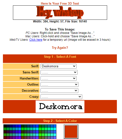 Buat GIF teks dan gunakan untuk penggunaan pribadi atau komersial dengan pembuat GIF teks 3d ini. Dengan berbagai macam font dalam kategori seperti serif, sans-serif, tulisan tangan, garis besar, dekoratif, dan gila, serta palet warna yang layak, teks Anda pasti akan menarik perhatian audiens Anda. Ada dimensi default atau Anda dapat menentukan dimensi khusus untuk GIF Anda. Untuk pro di sini, Anda dapat memilih variabel seperti kedalaman, kemiringan, dan bingkai. Pilih efek animasi, kecepatan, dan ukuran font, dan lihat bagaimana teks animasi Anda akan terlihat di kotak teks sampel. Pilih frekuensi pengulangan, masukkan teks b di kotak yang tersedia, dan klik 'Buat Teks 3D!'. Anda siap untuk pergi.