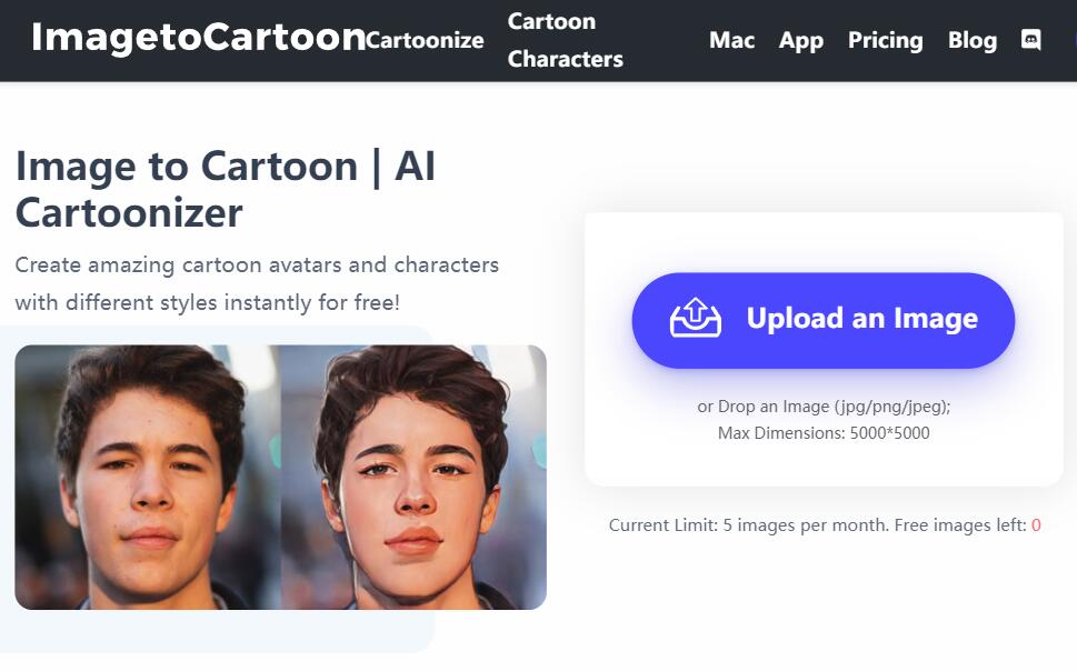 Image to Cartoon memungkinkan Anda secara instan membuat avatar kartun yang tampak menarik dari gambar Anda dan menerapkan berbagai gaya untuk menyesuaikannya. Aplikasi ini mendukung gambar dengan dimensi maksimum 5000×5000, yang berarti Anda dapat membuat gambar avatar kartun yang besar. Gambar apa pun yang Anda unggah akan dihapus dari server setelah 3 jam. Jika Anda ingin bersenang-senang dengan ini Kartunis AImenerapkan efek kartun yang menyenangkan ke gambar avatar Anda. Efek-efek ini mengubah gambar kartun Anda menjadi karakter karier, karakter bisnis, pahlawan super, karakter olahraga, dan banyak lagi.
