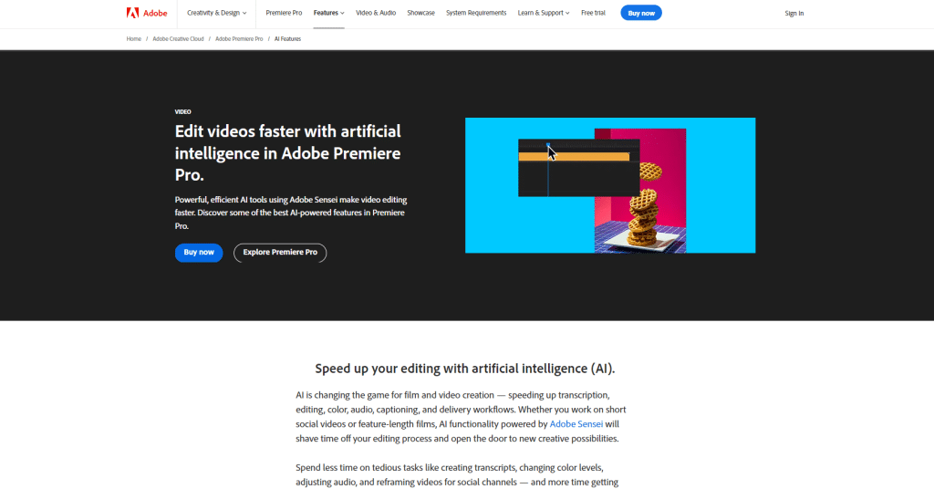 Adobe Premiere Pro. mempercepat pembuatan video Anda dengan editor video AI-nya. Ini memberdayakan Anda untuk menghabiskan lebih banyak waktu untuk mendapatkan inspirasi dan menyampaikan cerita dengan video yang luar biasa dan lebih sedikit waktu untuk proses pengeditan video, seperti mengunggah audio, memasukkan subtitle, menambahkan transisi dan efek, dan banyak lagi.