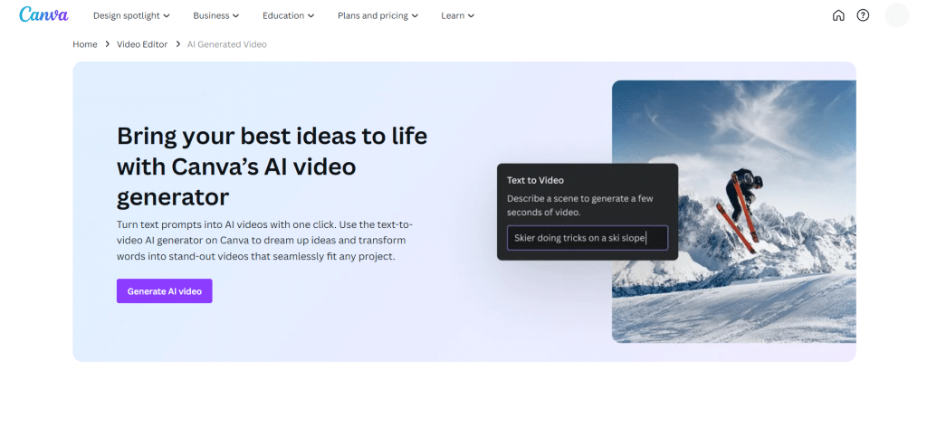 Canva memungkinkan Anda mewujudkan ide secara ajaib dengan editor video AI teks-ke-video. Hanya dengan satu klik, ini dapat mengubah adegan di otak Anda menjadi video AI dalam hitungan menit. Misalnya, jika Anda memasukkan teks “siswa sedang duduk di kelas”, maka akan dihasilkan adegan yang sesuai dengan cerita Anda. Selain itu, beberapa opsi penyesuaian tersedia bagi Anda untuk mempersonalisasi video Anda, seperti ukuran layar, durasi video, dan banyak lagi.