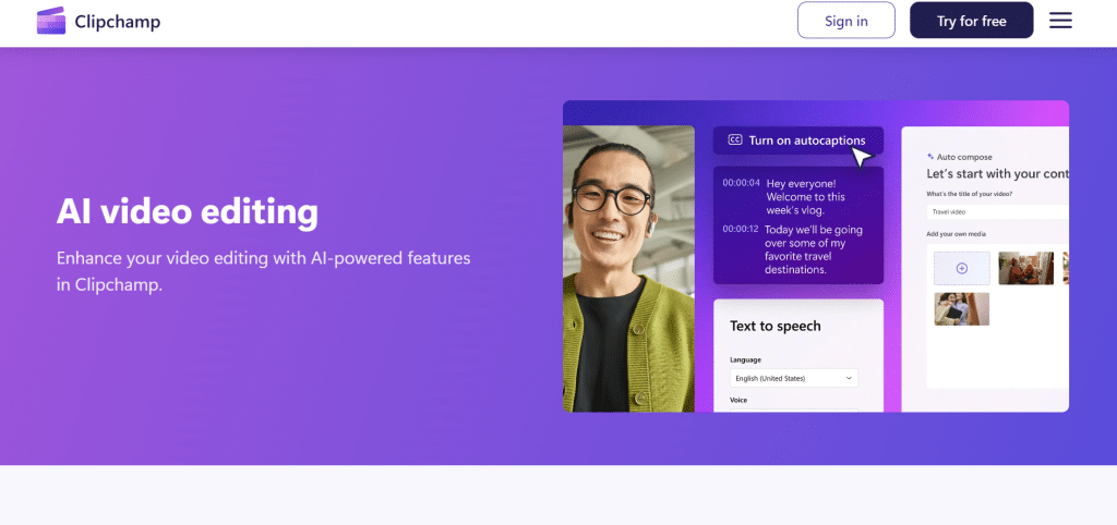 Clipchamp memperkenalkan editor video AI untuk menyempurnakan pengeditan video Anda dengan fitur-fiturnya yang didukung AI. Baik Anda akan membuat video tayangan slide, panduan perjalanan, atau video untuk media sosial, ia menawarkan berbagai templat yang dapat disesuaikan untuk Anda pilih. Editor memungkinkan Anda mengedit video dengan menambahkan efek animasi, teks narasi, transisi, dan banyak lagi. Setelah mengedit video Anda, jangan ragu untuk mengekspornya dalam format MP4 untuk digunakan lebih lanjut, misalnya mengunggah video tersebut ke YouTube untuk mencapai target audiens Anda.