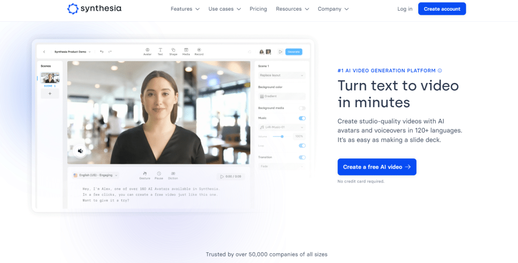 Yang membedakan Synthesia adalah kemampuan multi-bahasanya, di mana 120+ bahasa dapat dihasilkan ke dalam video AI tanpa Anda mempelajarinya. Lebih dari sekadar editor video AI, ini memberdayakan pengguna untuk membuat video AI yang menarik secara visual dengan 160+ avatar AI, termasuk pelatihan orientasi, pelajaran e-learning, dan video instruksional, menggantikan skrip dan PowerPoint yang membosankan. Tidak memerlukan kamera, mikrofon, atau studio, ini mengoptimalkan proses pembuatan video AI, memberdayakan Anda untuk membuat video bertenaga AI dalam hitungan menit. Jika Anda tidak tahu apa yang harus dibuat, ia juga menyediakan asisten skrip AI, yang membantu membuat petunjuk untuk mengaktifkan pikiran Anda.