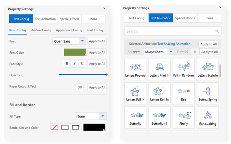 Dopo aver convertito il testo in video, puoi modificare lo stile del testo secondo necessità. Questo creatore di video di testo ti consente di modificare facilmente il colore, la dimensione, il carattere e le animazioni del testo.