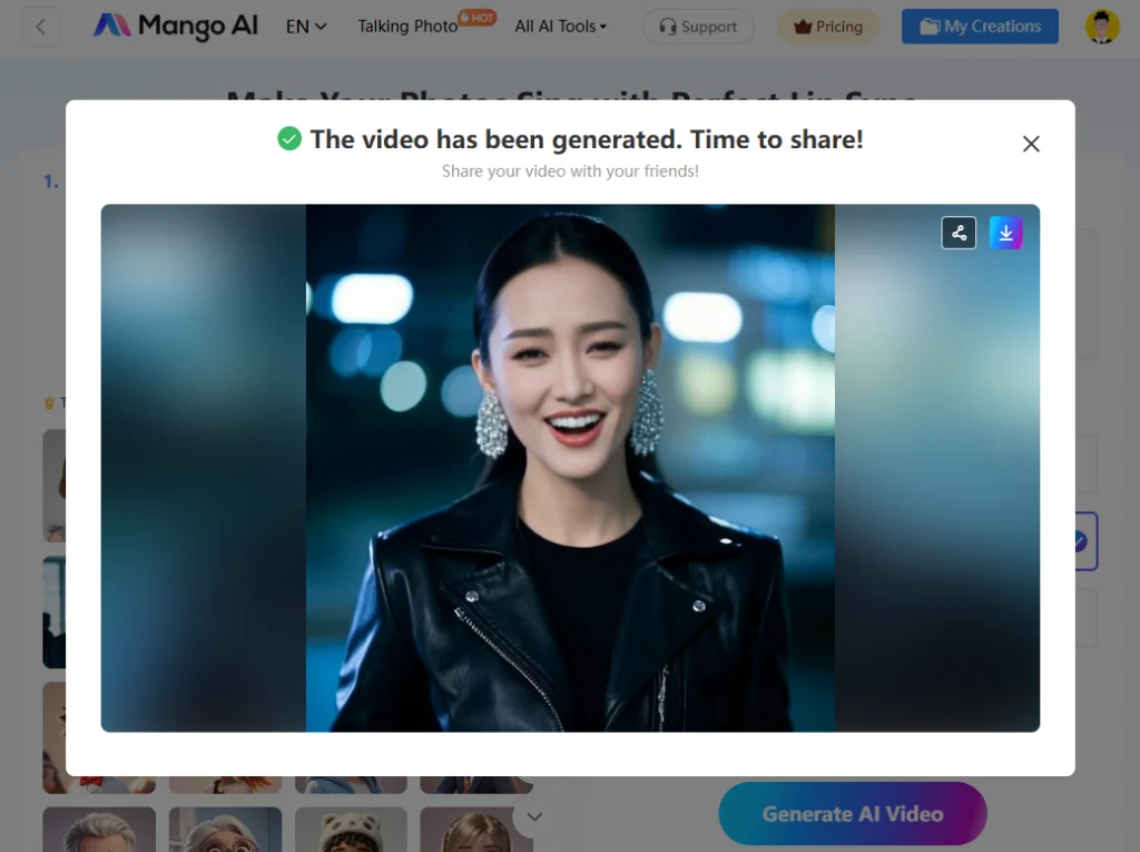 Mango AIで歌唱画像を生成し終えたら、動画ファイルをパソコンや携帯端末にダウンロードするか、共有可能なリンクをコピー&ペーストするだけです。それはあなたのソーシャルメディアチャンネルで共有するための高解像度のビデオになります。