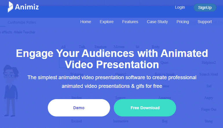 Animiz ir viens no vienkāršākajiem tāfeles animācijas rīkiem. Varat izveidot ļoti saistošu saturu animētu videoklipu veidā bez jebkādām profesionālām prasmēm. Lietotāji iegūs daudz iepriekš sagatavotu lietošanai gatavu veidņu, kas piešķirs papildu pieskārienu tāfeles paskaidrojuma videoklipiem. Tas piedāvā efektu elementus un lomas, lai izveidotu satriecošus animētus videoklipus. Lietotāji var bez maksas koplietot animētus skaidrojošos videoklipus un izvēlēties maksas pakotnes savām vajadzībām un prasībām.