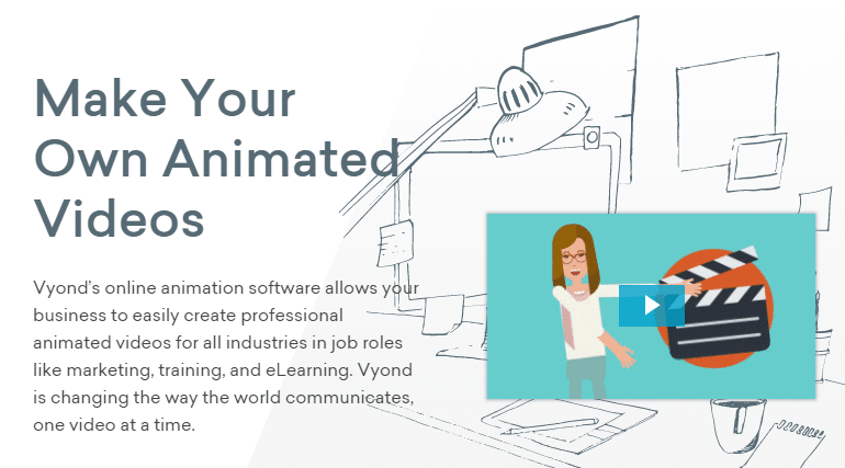 Iepriekš pazīstams ar nosaukumu GoAnimate, Vyond piedāvā izcilas tāfeles animācijas video izveides iespējas profesionāliem animatoriem. Vyond var kļūt par jūsu iecienītāko animācijas programmatūru. Ir neskaitāmas iepriekš izveidotas un lietošanai gatavas veidnes, multivides faili un balss pārraides iespējas. Ar Vyond un pielāgojiet visu, veicot vienkāršas darbības. Ērti veiciet nepieciešamās izmaiņas savos animētajos videoklipos un izmantojiet vecos projektus jauniem mērķiem. Viena lieta, kas jāpatur prātā, ir tāda, ka, tāpat kā lielākā daļa tāfeles animācijas rīku, Vyond piedāvā nevis ikmēneša, bet gada plānus un bezmaksas izmēģinājuma versiju.