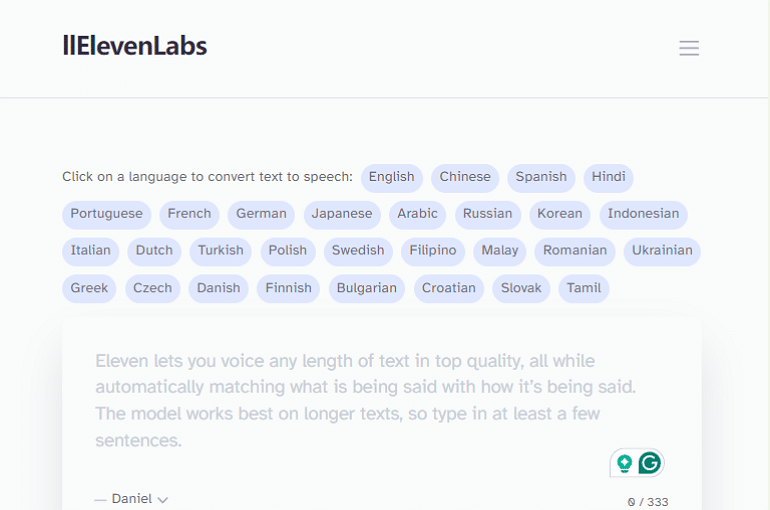 Vai nepieciešams dublēt dažādas rakstzīmes vai uzlabot balss efektus? Elevenlabs ir AI balss pārraides ģenerators bez maksas ar skaņas efektu funkciju. Viss, kas jums jādara, ir jāievada teksta uzvedne, un tiks ģenerētas visas iespējamās balsis. Izmantojot skaņas efektu ģeneratoru, varat radīt dažus standarta skaņas efektus, piemēram, pērkona negaisu, lauvas rēkšanu un durvju zvanus. Turklāt šis rīks var izveidot dažādas rakstzīmju balsis, kas piemērotas dažādiem scenārijiem. Lai saglabātu jūsu satura stilu, ir pieejama emociju pievienošana un balss izvades iestatījumu pielāgošana.