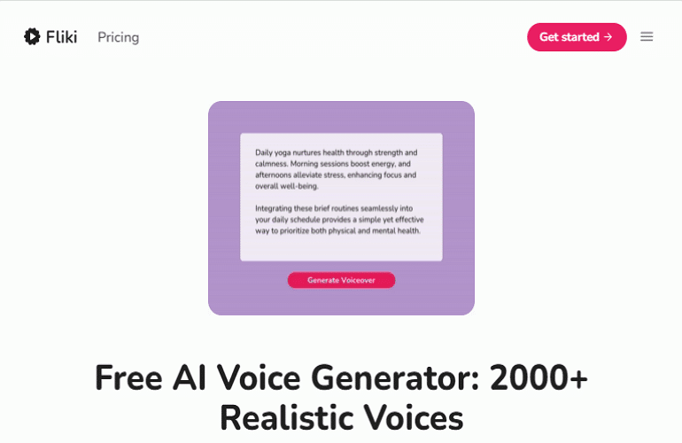 Fliki, kas ir pazīstama ar savu balss bibliotēku un balss klonēšanu, ir jaudīgs mākslīgā intelekta balss pārraides ģenerators, un tas palīdz izveidot balss pārraides dažādiem projektiem, piemēram, audiogrāmatām, e-mācībām, aplādes, dokumentālajām filmām, YouTube stāstījumam un citiem. Tas piedāvā vairāk nekā 2000 cilvēcisku balsu teksta pārvēršanai runā vairāk nekā 70 valodās. Kad esat izvēlējies vajadzīgo balsi, varat pielāgot balsi, atlasot atbilstošas emocijas un kontrolējot savas runas augstumu, ātrumu un pauzes. Ja nevēlaties izmantot Fliki nodrošinātās balsis, tās balss klonēšanas funkcija ļauj izveidot reālistisku balss klonu un pēc tam izvēlēties balsi, lai ģenerētu savu balsi.