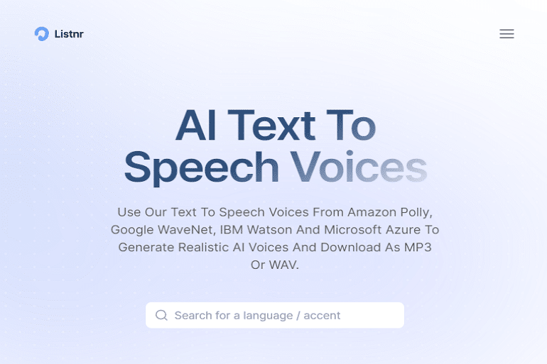 Listnr ļauj izveidot balss pārraides ar vairāk nekā 1000 balsīm vairāk nekā 100 valodās un akcentiem, tostarp jūsu balss klonēšanu. Tā AI balsis nāk no Amazon Polly, Google Wavenet, IBM Watson un Microsoft Azure, nodrošinot cilvēkiem līdzīgas un reālistiskas balsis. Izmantojot savu video studiju, šis AI balss pārraides ģenerators bez maksas ļauj to viegli integrēt dažādās platformās, piemēram, YouTube, TikTok, Invideo, Veed utt.