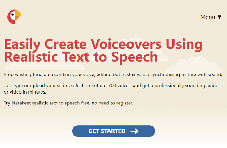 Ja esat iesācējs teksta pārveidē runā un vēlaties pārveidot savu skriptu balsī, nav nepieciešams izmantot dažas uzlabotas rediģēšanas funkcijas. Narakeet atbilst jūsu vajadzībām. Tas piedāvā intuitīvu un vienkāršu saskarni, kas ļauj ielīmēt stāstījuma skriptu vai augšupielādēt jebkuru dokumentu un subtitru failus, izvēlēties savu balsi un valodu, pielāgot skaņas izvadi un iegūt audio failu. Varat pielāgot runas ātrumu un skaļumu. Vēl viena šī bezmaksas AI balss pārraides ģeneratora īpašā iezīme ir trīs audio faila izvades modeļi: viens audio fails, audio un subtitri, kā arī viens audio fails katrā ainā, kas ļauj labāk kontrolēt balss un video sinhronizāciju.