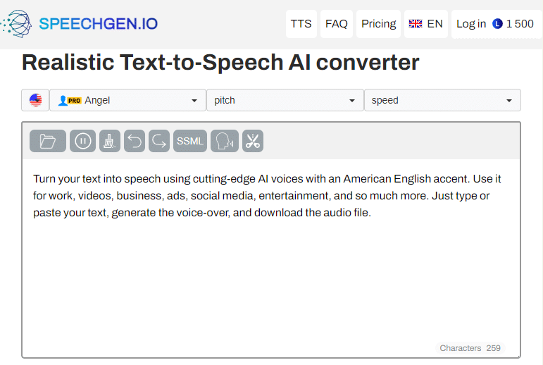 Speechgen ir AI balss pārraides ģenerators bez maksas, kas palīdz nodrošināt balss ģenerēšanas efektivitāti. Šis rīks izceļas ar tā ilgstošo teksta apstrādes iespēju. Ja iegādājaties pietiekami daudz rakstzīmju, varat vienlaikus pārvērst līdz 2 000 000 rakstzīmju teksta runā. Izmantojot SSML iezīmēšanas iespējas, Speechgen ļauj mainīt ātrumu, augstumu, uzsvaru, izrunu, intonāciju un uzsvaru, kā arī pievienot pauzes vai citus audio efektus, padarot jūsu balsi dabiskāku.