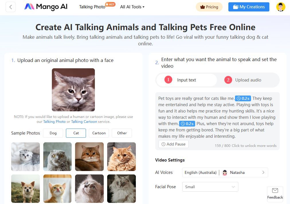 Video's met pratende dieren kunnen voor veel doeleinden worden gebruikt, behalve voor de lol. Het is een haalbare oplossing om het dier te laten spreken voor de marketing van je dierenbedrijf of voor je sociale media-inhoud om meer verkeer te krijgen. Mango AI is een echte leider in AI-video's voor pratende huisdieren die je moet uitproberen. Het blinkt uit in het levendig laten praten van een dier op basis van alleen een foto en spraak. Met een breed scala aan AI-stemmen en de aanpassing van gezichtshoudingen, kunt u gemakkelijk schattige pratende huisdiervideo's maken. Bovendien is Mango AI's Zingende foto kun je een dier een liedje laten zingen! Dus waarom wachten? Start vandaag nog een gratis proefversie en laat Mango AI zijn werk doen!