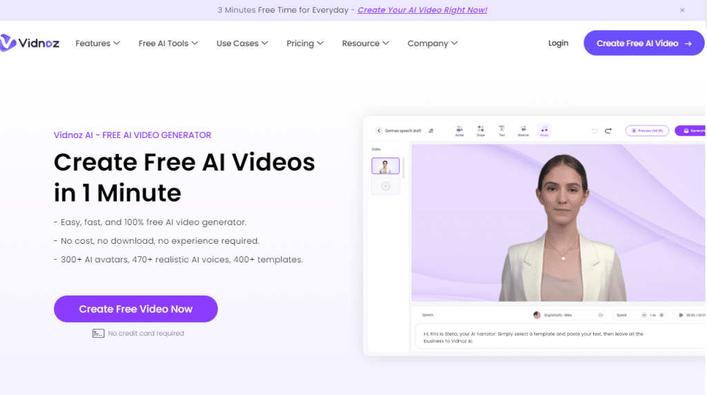 Gratis AI-videogenerator Vidnoz AI beweert gebruikers in staat te stellen om in slechts een minuut online AI-videogezichtswisseling te maken. Er zijn geen bijbehorende kosten, downloads of eerdere ervaring vereist. Vidnoz ondersteunt zowel fotogezichtswisseling als videogezichtswisseling online. U hoeft alleen maar een foto/video met een gezicht als basisafbeelding/video te uploaden en vervolgens een foto met een gezicht als het gewenste gezicht te uploaden. Klik ten slotte om het gezicht te wisselen. Het biedt ook videosjablonen, avatars, AI-voice-over, enz. om uw videocreatieproces te vereenvoudigen en u te helpen eenvoudig gepersonaliseerde functies aan uw video's toe te voegen.