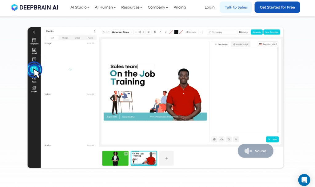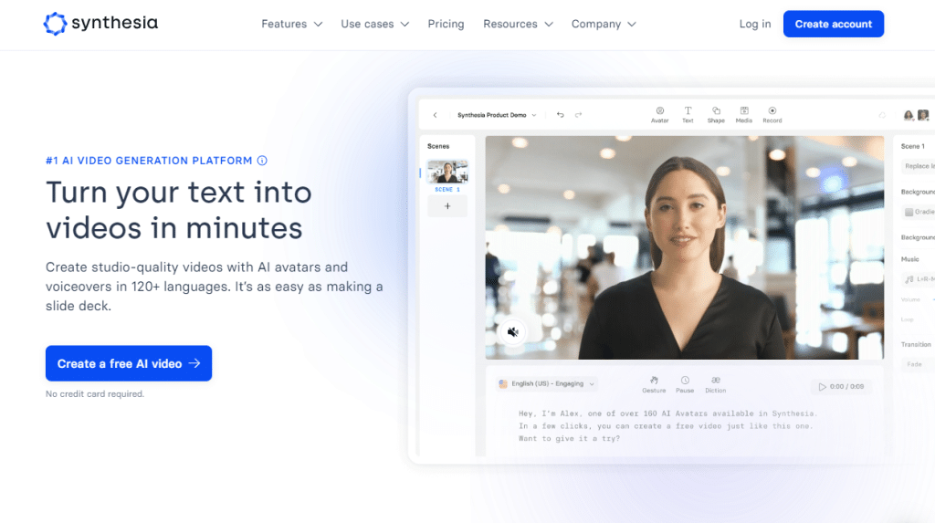 Synthesia, gespecialiseerd in AI-gestuurde videogeneratietechnologie, helpt creëren video's met pratende hoofden, deepfake-video's en meer video's. Hiermee kunnen gebruikers in 15 minuten professionele video's maken. Bovendien fungeert Synthesia als een online tool voor het wisselen van AI-video's en stelt u in staat uw videopresentator met eenvoudige klikken te vervangen. Bekijk Synthesia als een gratis AI-avatargenerator. Het heeft meer dan 140 verschillende AI-sprekende avatars waaruit u kunt kiezen. Of u kunt uw digitale tweeling creëren om unieke smaken aan uw video toe te voegen. Met 65+ eenvoudige maar professionele vooraf gemaakte videosjablonen hoeven gebruikers alleen hun eigen script te gebruiken en de sjabloon aan te passen met hun eigen tekst die op het scherm wordt weergegeven, vormen en media toe te voegen, enz., om snel video's te maken zoals professionele bedrijfstraining video's, instructie- en productvideo's, kennisbankvideo's en meer.