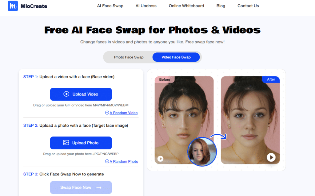 MioCreate, een professionele online whiteboardtool, brengt nu zijn gratis AI-gezichtswisseltools uit voor zowel foto- als videogezichtswissel. Het voltooien van een foto- of videogezichtswissel duurt slechts drie stappen. Voor videogezichtswissel online accepteert MioCreate GIF's of video's in M4V/MP4/MOV/WEBM-formaat voor gezichtswissel. Het ondersteunt een JPG/PNG/WEBP-afbeelding als de doelgezichtsafbeelding die u wilt verwisselen. Of als u geen idee hebt wat u moet maken of de gemaakte resultaten wilt zien, zijn er willekeurige video's/foto's die door MioCreate worden geleverd, die kunnen worden toegevoegd om u te inspireren.