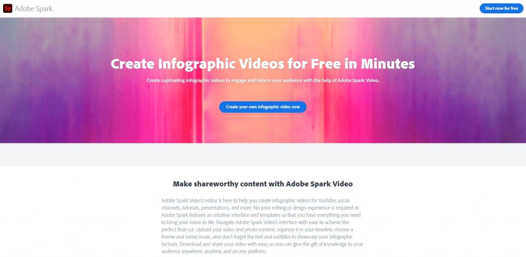 Adobe Spark wspiera użytkowników w przesyłaniu treści i wybieraniu motywu, który najlepiej pasuje do tematu ich infografiki wideo, zamiast dostarczania gotowych szablonów.