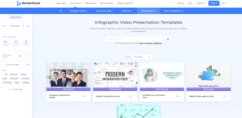 Możesz łatwo znaleźć szablony wideo z infografiką, klikając słowo infografika wideo w Renderforst. Istnieje szeroki wybór scen infografiki, które umożliwiają wizualną ekspresję danych do pracy.