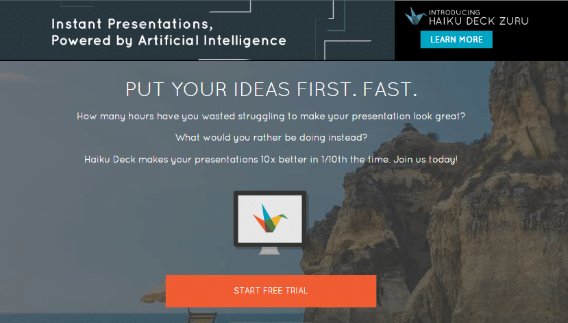 Haiku Deck se destaca como uma ferramenta de design de PowerPoint simples e versátil, perfeita para educadores, equipes de negócios e freelancers. Ele oferece uma interface clara e uma infinidade de modelos para simplificar a criação de apresentações. Escolha entre fontes, layouts, filtros de imagem e planos de fundo elegantes para aprimorar suas apresentações de slides. Ele vem com milhões de imagens. Depois de inserir algumas palavras-chave em um slide, este software pesquisa rapidamente imagens adequadas ao seu assunto. Além disso, a sua compatibilidade com Windows e Mac torna-o uma escolha acessível para todos.