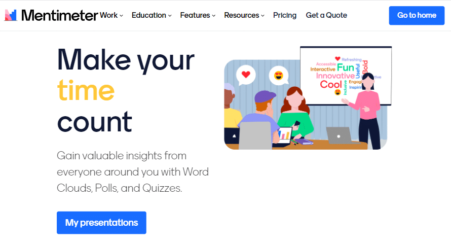 O Mentimeter é um criador de apresentações de slides interativas que é compatível com Windows e Mac. Ele ajuda você a criar apresentações impressionantes com mais facilidade do que nunca. Personalize uma série de modelos de slides pré-concebidos para atender às suas necessidades. Adicione ícones, imagens, áudio e vídeos para enriquecer suas apresentações. O que é mais impressionante nesta ferramenta de design do PowerPoint é a sua gamificação. Ele permite que você crie enquetes ao vivo, questionários divertidos e pesquisas criteriosas para aumentar o envolvimento do público e tornar as apresentações mais intrigantes.