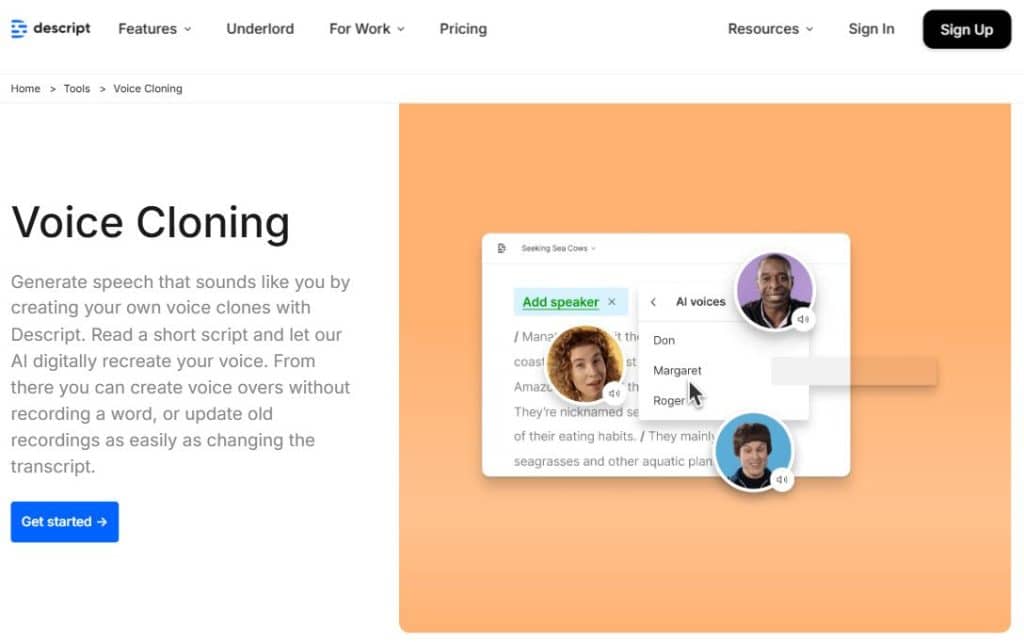Descript наиболее известен как платформа для редактирования видео и звука, позволяющая преобразовывать аудиоречь в письменный текст и наоборот. В ней также есть функция overdub, которая позволяет записывать и клонировать свой голос. После того как программа узнает ваш голос в процессе клонирования, вы сможете использовать клонированный голос для преобразования письменного текста в речь, которая звучит как вы.