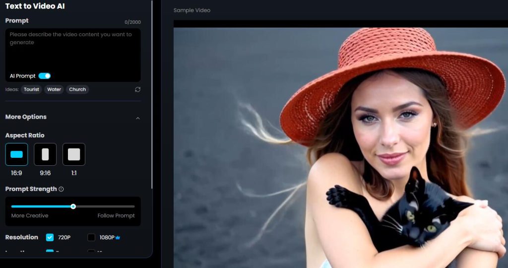 При создании видео из текста с помощью DeeVid AI длина может составлять 5 или 10 секунд в разрешении 720p или 1080p. Параметры соотношения сторон: 16:9 для letterbox, 9:16 для вертикального экрана или 1:1 для традиционной квадратной презентации. А если вы хотите исключить какие-либо объекты, стили или другие элементы или характеристики из вашего видео, их можно описать в разделе Negative Prompt.