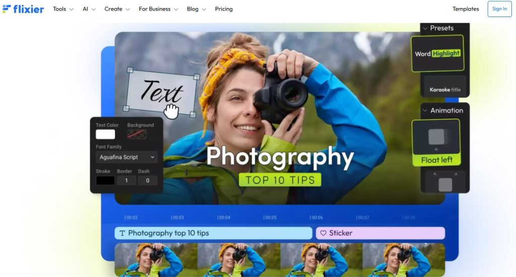 Flixier — это создатель текста в видео, который может создавать анимированный текст с захватывающими заголовками, субтитрами и титрами. Инструмент имеет огромную библиотеку из более чем 1000 шрифтов и более 300 000 элементов движения и графики, включая динамические наклейки, полосы загрузки, таймеры обратного отсчета, адаптивные призывы к действию и многое другое.