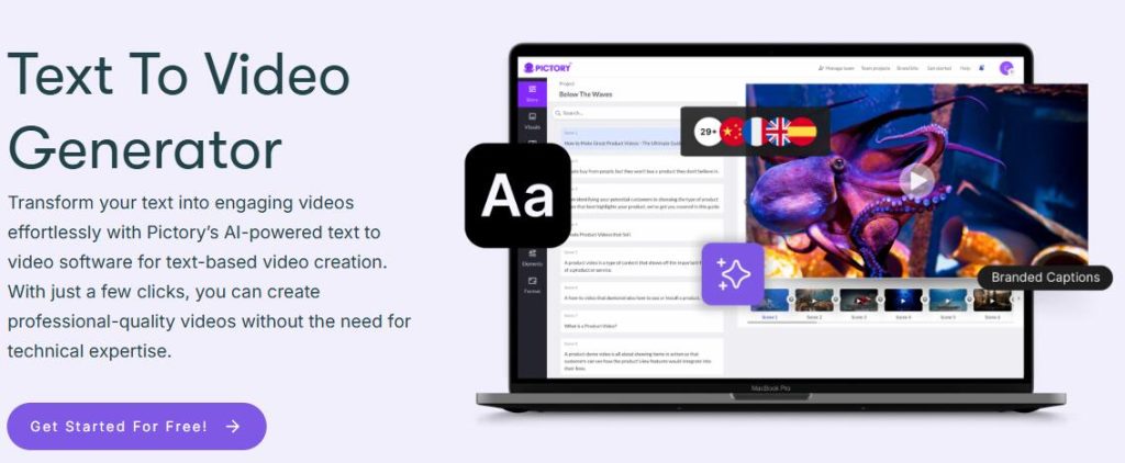 Pictory — это программа для преобразования текста в видео на базе искусственного интеллекта, которая позволяет создавать видео профессионального качества из введенного текста за считанные секунды. Создатели контента любят использовать Pictory для преобразования своих историй, сценариев, статей и блогов в привлекательные видео с надежной анимацией, визуальными эффектами и фоновой музыкой. Существует огромная библиотека из более чем 18 миллионов бесплатных видео, музыкальных треков и изображений, которые помогут вам еще больше обогатить свой видеоконтент, максимизируя вовлеченность и удержание зрителей.