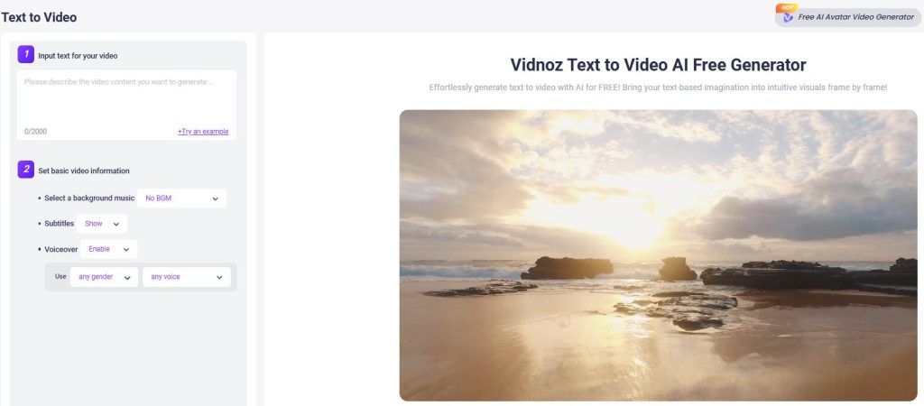 Vidnoz — это узнаваемый текст в видео, который позволяет вам воплотить в жизнь свое воображение. Каждый кадр видео создается на основе определенных слов вашего текстового описания. Vidnoz полностью бесплатен для коммерческого или личного использования.