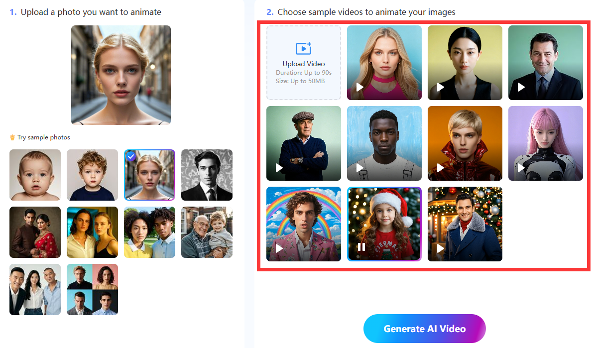 Однако, если у вас есть собственный пример анимации, который вы хотели бы использовать в движущемся фильме, вы можете загрузить его. ИИ точно так же применит анимацию к вашему статическому изображению.