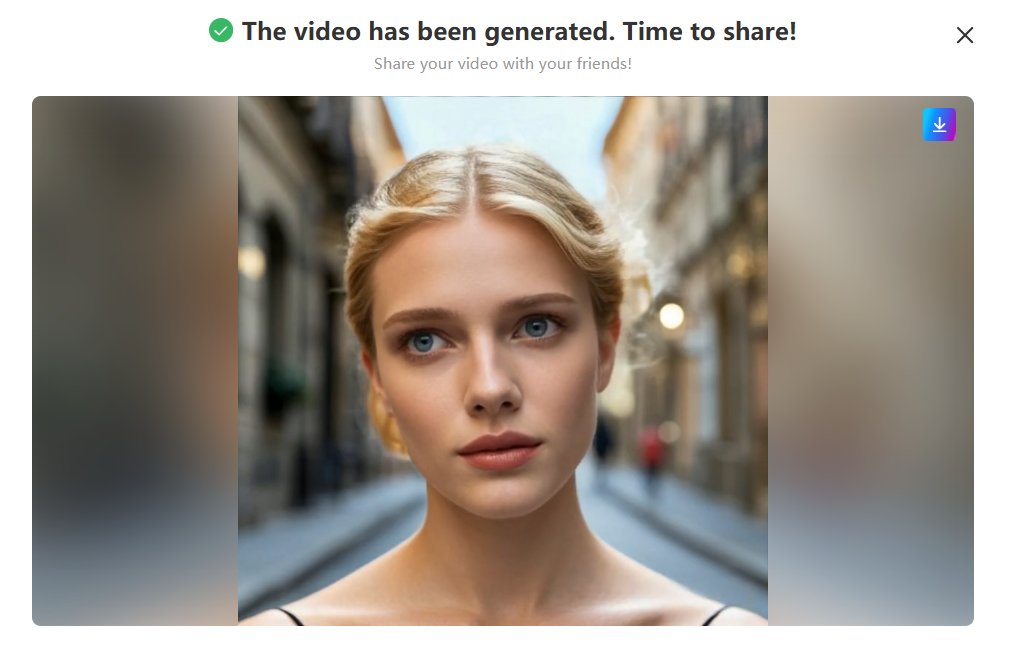 Наконец, нажмите кнопку «Сгенерировать видео с ИИ», чтобы объединить статичное изображение и анимацию и создать уникальное движущееся фотовидео. Вы можете предварительно просмотреть движущееся изображение, чтобы убедиться, что оно соответствует вашим требованиям. Если да, скачайте видеофайл и опубликуйте его в соответствующих социальных сетях, таких как Twitter, Facebook и Instagram.
