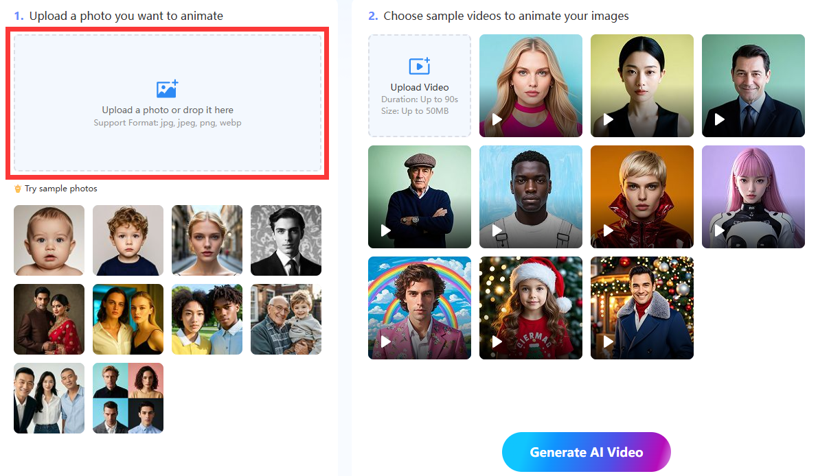 Mango AI может анимировать фронтальное изображение человека, животного или персонажа мультфильма. Если у вас нет изображения, платформа предлагает серию готовых изображений для использования в ваших движущихся фотографиях.