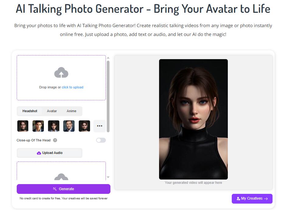 CoCoClip.AI tar AI-fotoprat till nästa nivå. Om du har minnesvärda statiska bilder eller bilder som du vill väcka till liv kan det här verktyget återuppliva dessa minnen i verklighetstrogna videor. Ditt tidigare stillastående porträtt kommer nu att ha realistisk läppsynkronisering när det talar de ord du vill ha.