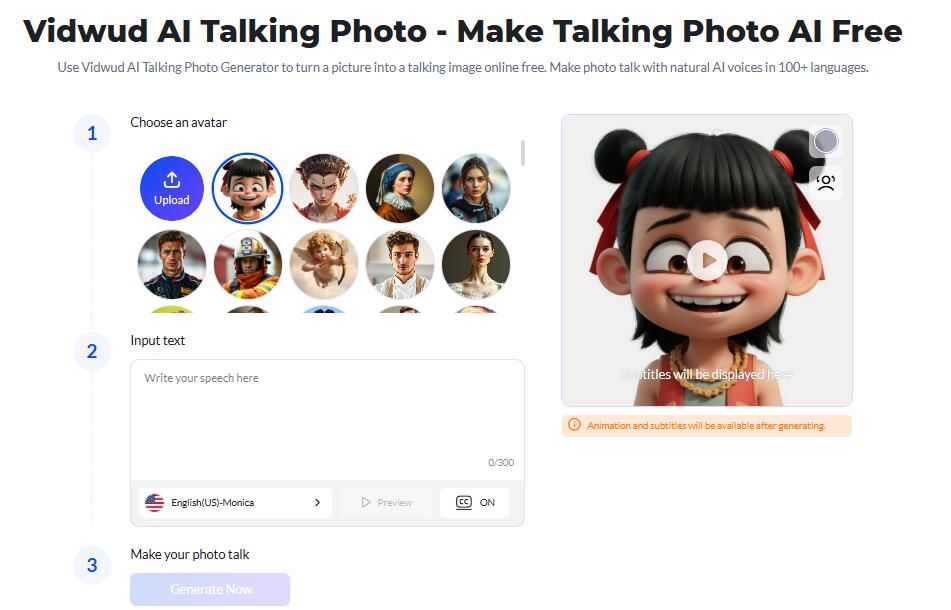 Vidwud är ett unikt, gratis, talande AI-fotoverktyg som förvandlar alla porträtt- eller avatarbilder till ett talande foto. Naturliga AI-röster för olika åldrar, kön och scenarier finns tillgängliga på över 100 språk. De valfria scenarierna för dina AI-röster inkluderar nyhetssändningar, poesi, berättarröst, ljudböcker, e-lärande, annonser, förklarande texter, hälsningar och mer.