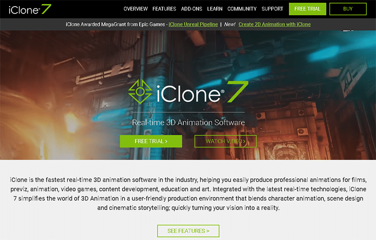 iClone är ett program för 3D-animering och rendering i realtid. Det är både ett verktyg för 3D-karaktärsgenerering och 3D-animeringsprogram. Att skapa realistiska 3D-modeller är ett enkelt arbete med iClone. Alla 3D-karaktärer är automatiskt riggade och redo för animering, så du behöver inte anpassa bildruta för bildruta. Liksom andra jämförbara animeringsprogram, har iClone en rörelseredigerare som gör att du kan rikta om motion capture-filer. Förutom detta innehåller denna programvara ett komplett ljussystem och en fysikmotor. Det ger användarna en 30-dagars gratis provperiod.
